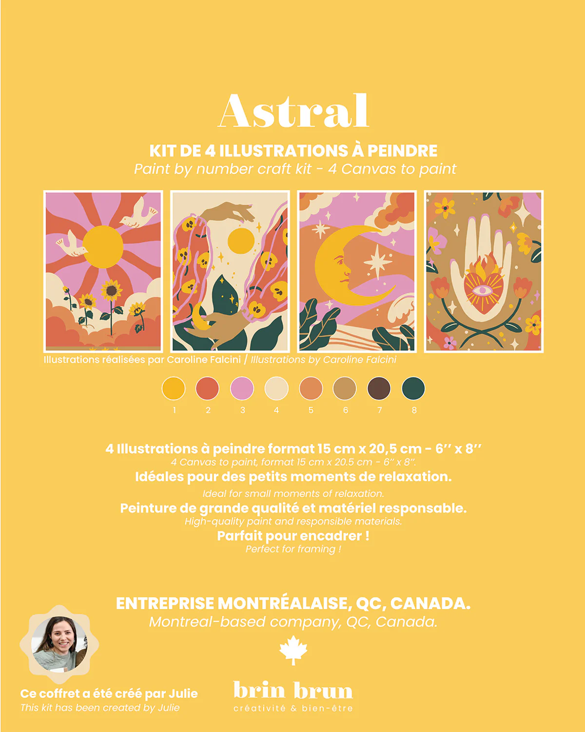 L’art du calme, un astre à la fois. Découvrez ce kit de 4 peintures à numéros Astral guidées conçue pour ceux et celles qui cherchent à ralentir. Il s’agit du kit parfait pour se déconnecter des écrans et s’offrir une pause bien-être, seul.e ou entre ami.e.s.